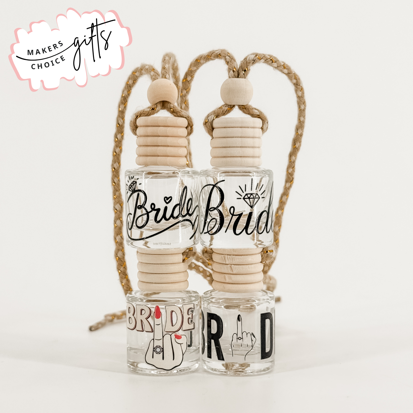 Long Lasting Car Diffuser – Our Bridal Edition Car Diffusers (also known as car fresheners) are hand-filled with clean fragrance oils for a lasting, premium scent experience. Designed to dangle from your rearview mirror, they feature a unique design printed directly on the bottle. These diffusers are truly the best on the market! No bland labels, just amazing scents and bridal-inspired beauty that lasts.